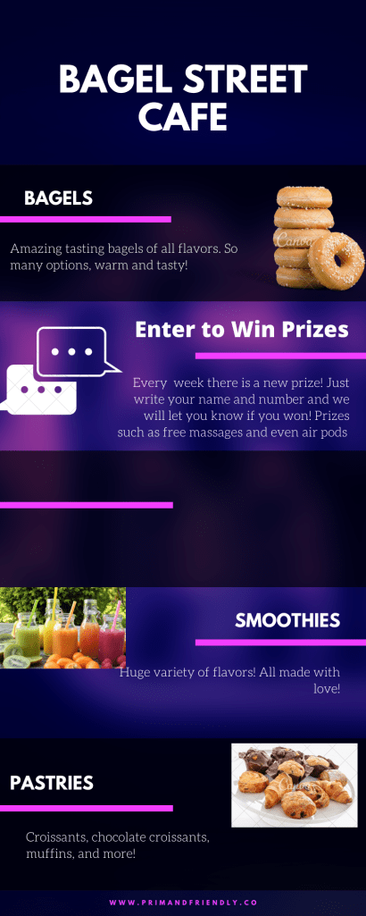 I did my infographic on Bagel Street Cafe. I wanted to bring more of my final project into my blog posts so I can get more practice making posts for it!